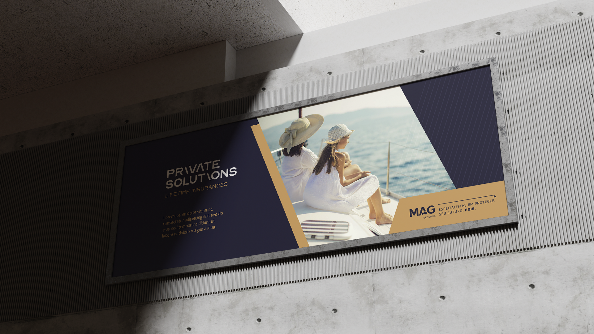 Reposicionamos estrategicamente a Linha Private Solutions da MAG Seguros com o desafio de comunicar-se de forma ainda mais relevante com um público de alto poder aquisitivo, valorizando atributos como exclusividade, personalização e confiança. O objetivo foi ir além do conceito tradicional de seguro, apresentando soluções sob medida que acompanham as diferentes necessidades e fases da vida desses clientes, sem perder a essência e os valores da marca original — pautada pela solidez, credibilidade e proximidade.